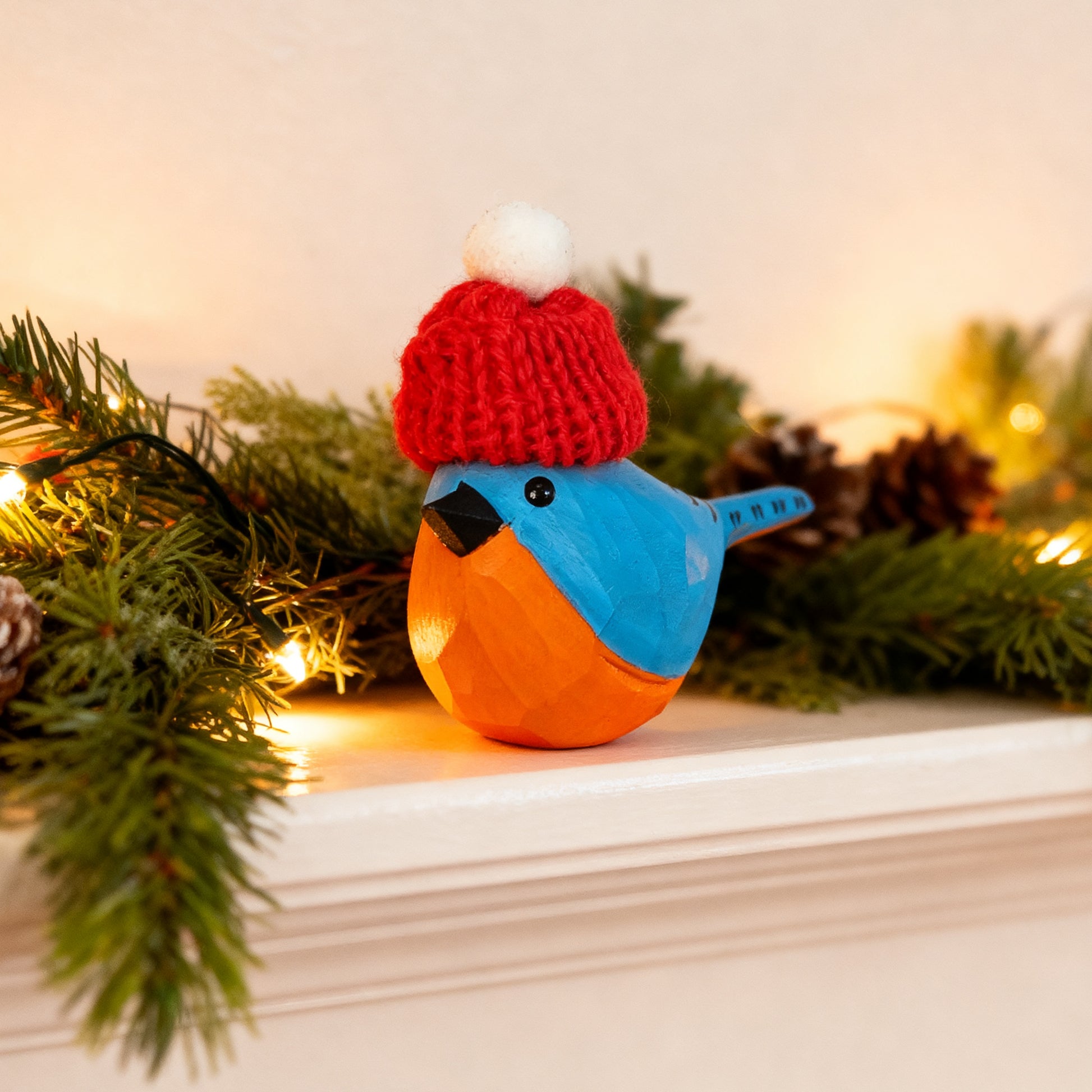 Bring a burst of color to your holiday tree with this handcrafted Eastern bluebird ornament. Carved from solid wood and hand‑painted in the species' signature sky‑blue and warm orange, it’s finished with a cozy red knit hat and a white pom for festive charm. Lightweight and shatter‑resistant, it hangs beautifully or sits freestanding on mantels, shelves, and table place settings. Arrives ready to gift in a premium box - perfect for bird lovers, nature‑inspired decor, and farmhouse Christmas themes.