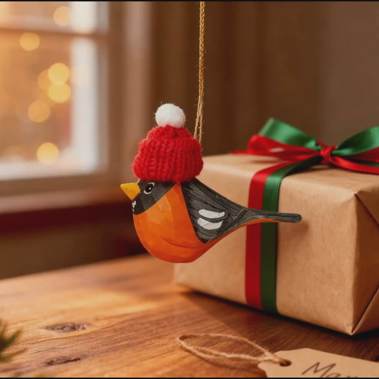 Bring cozy woodland charm to your holidays with this handcrafted American robin ornament. Each bird is carved from wood, hand‑painted in vibrant orange and charcoal tones, and topped with a snug red knit hat. Display it hanging on the tree or freestanding on a mantel or holiday table. It arrives in a premium gift box - ready to delight bird lovers and festive decorators alike.