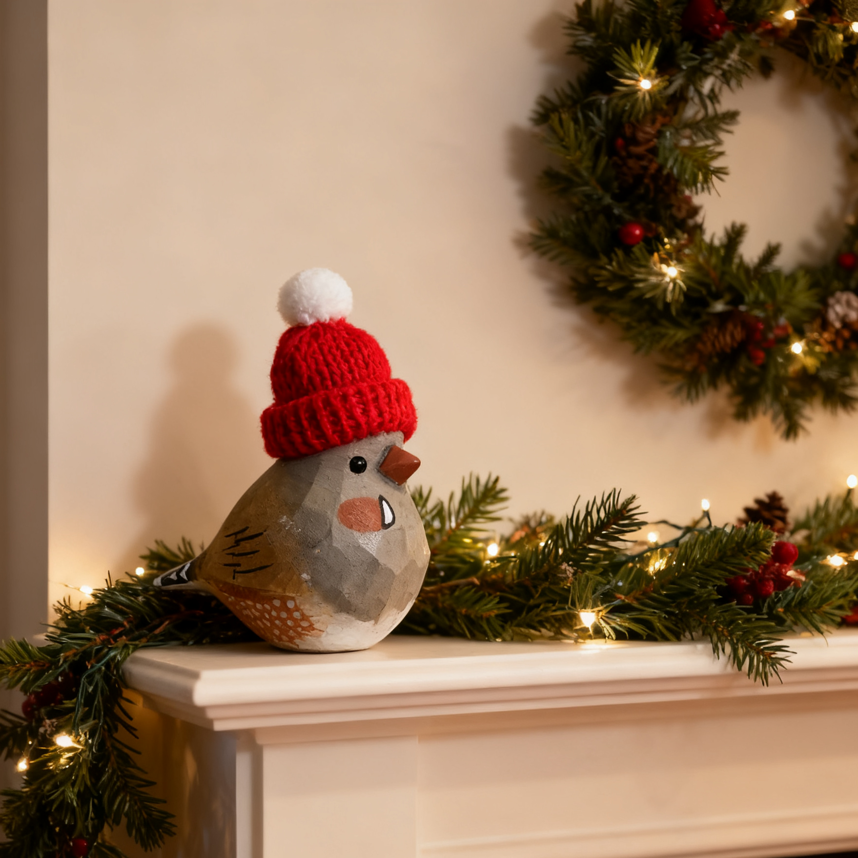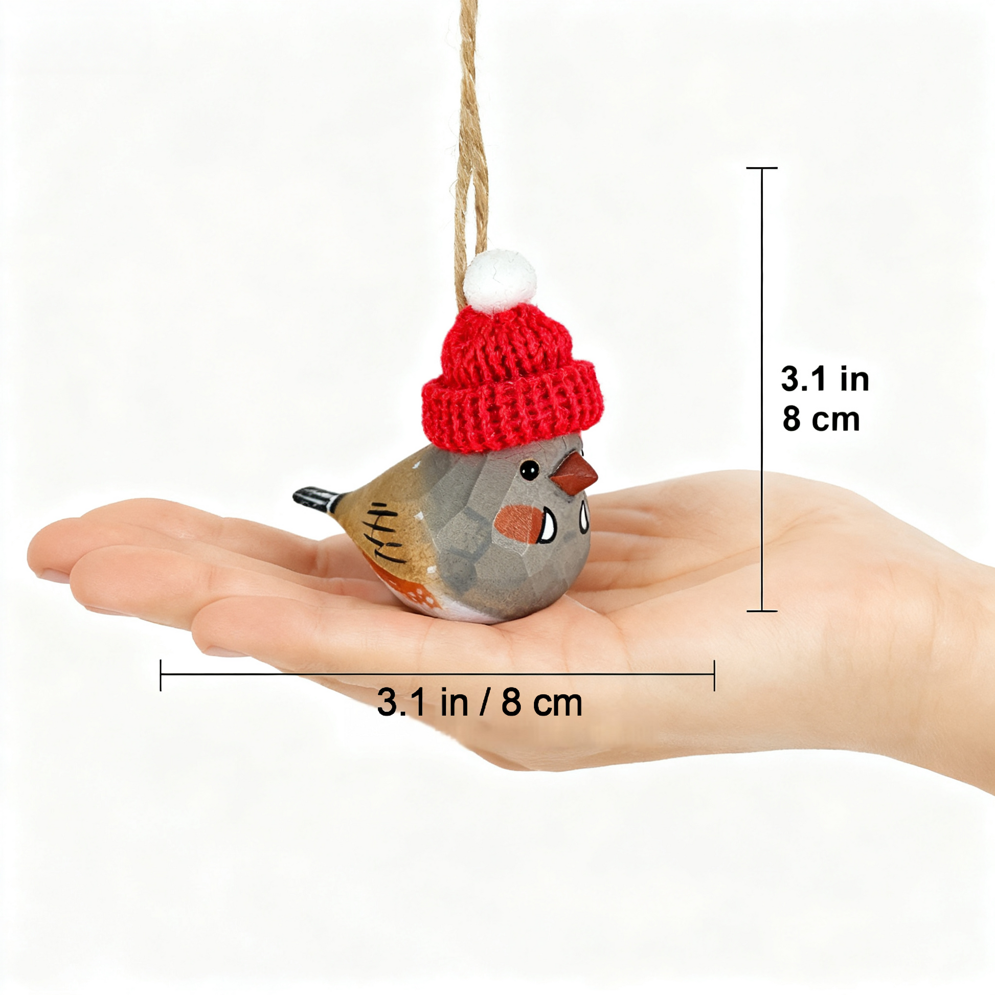 Bring cheerful, modern‑rustic charm to your holiday decor with this handcrafted Zebra Finch ornament. Each piece is carved from solid wood, hand‑painted with the finch’s signature orange cheek patch and speckled sides, and topped with a cozy red knit hat and white pom. Lightweight and shatter‑resistant, it hangs beautifully from its natural jute loop and also sits securely on a mantel or shelf. Arrives ready to gift in a premium keepsake box - perfect for bird lovers and festive stocking stuffers.